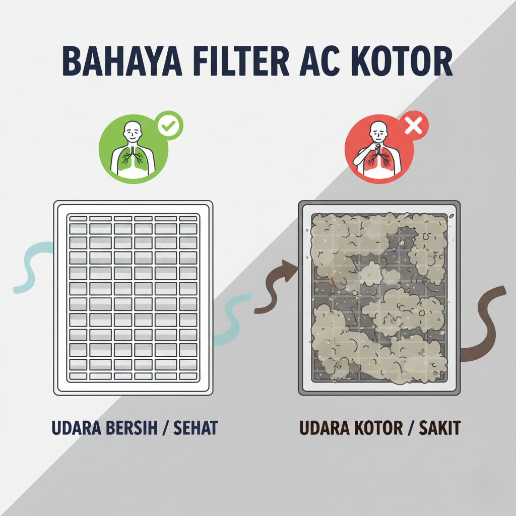 Jika dibiarkan tanpa perawatan rutin, kotoran dan debu bisa menumpuk di filter, evaporator, dan saluran udara. Akibatnya, kualitas udara di ruangan menurun dan bisa berdampak langsung pada kesehatan penghuni rumah.